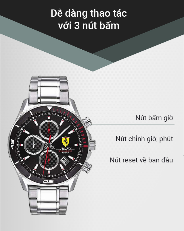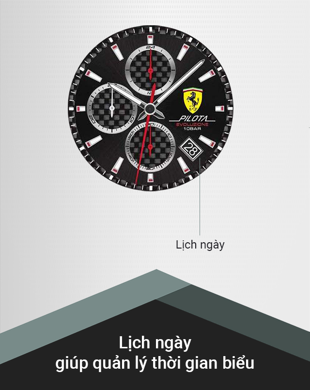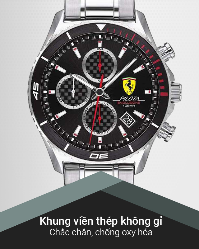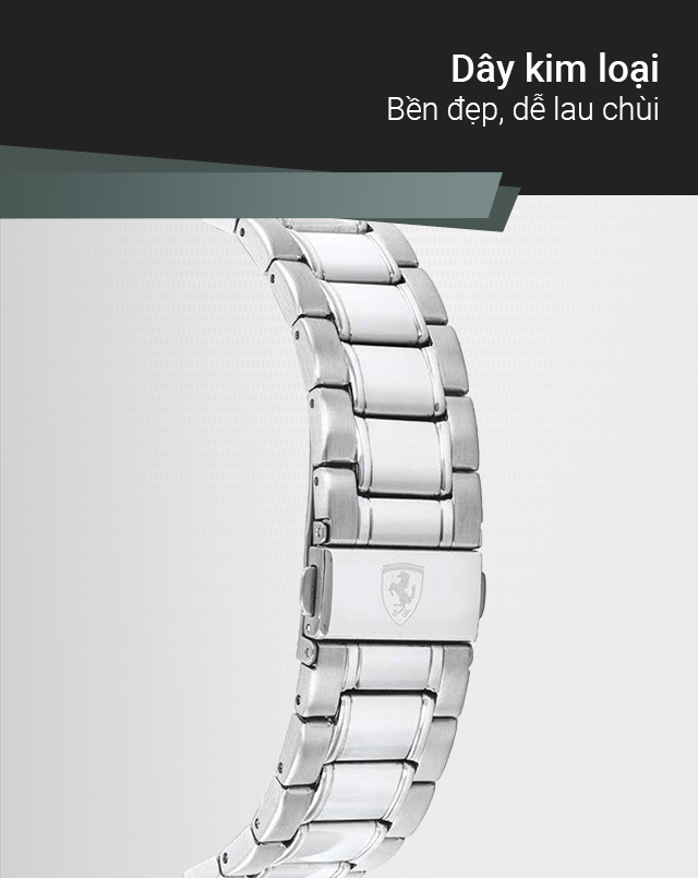 - Thiết kế ấn tượng, mạnh mẽ, đẳng cấp, lấy cảm hứng từ những siêu xe của họ, đồng hồ Ferrari là bộ sưu tập không thể thiếu đối với những bạn trẻ có niềm đam mê về tốc độ. Tất cả các quá trình làm nên chiếc đồng hồ từ thiết kế có đến lắp ráp đều được hãng theo dõi gắt gao để mang đến người dùng một sản phẩm chỉnh chu và hoàn thiện nhất đến từng chi tiết.