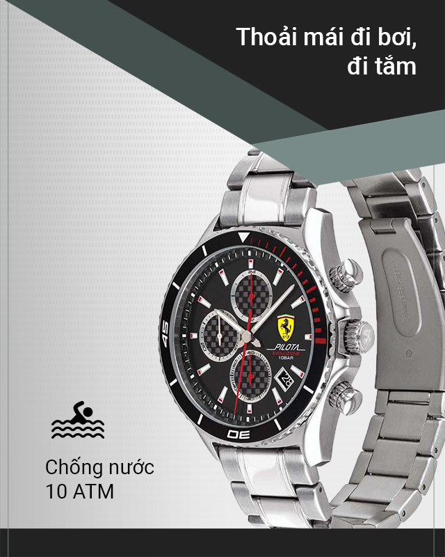 - Khả năng chống nước tới 10 ATM giúp bạn thoải mái đeo đồng hồ khi đi mưa, bơi lội, tắm, không nên mang khi lặn