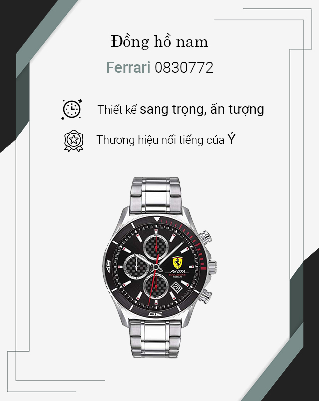- Thương hiệu đồng hồ Ferrari đến từ Ý, nổi tiếng với phong cách thể thao ấn tượng