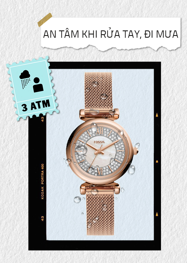 - Thoải mái đeo đồng hồ khi rửa tay hay đi dưới trời mưa nhỏ với độ chống nước 3 ATM, không nên mang khi tắm, bơi lội