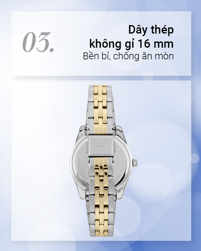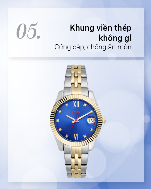 - Dây và khung viền thép không gỉ bền chắc, chống ăn mòn, giữ đồng hồ luôn sáng bóng, cho cảm giác mát tay khi đeo