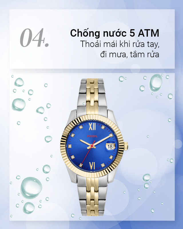 - Chống nước 5 ATM: Yên tâm đeo đồng hồ khi tắm, đi mưa mà không lo vào nước, không mang khi bơi, lặn