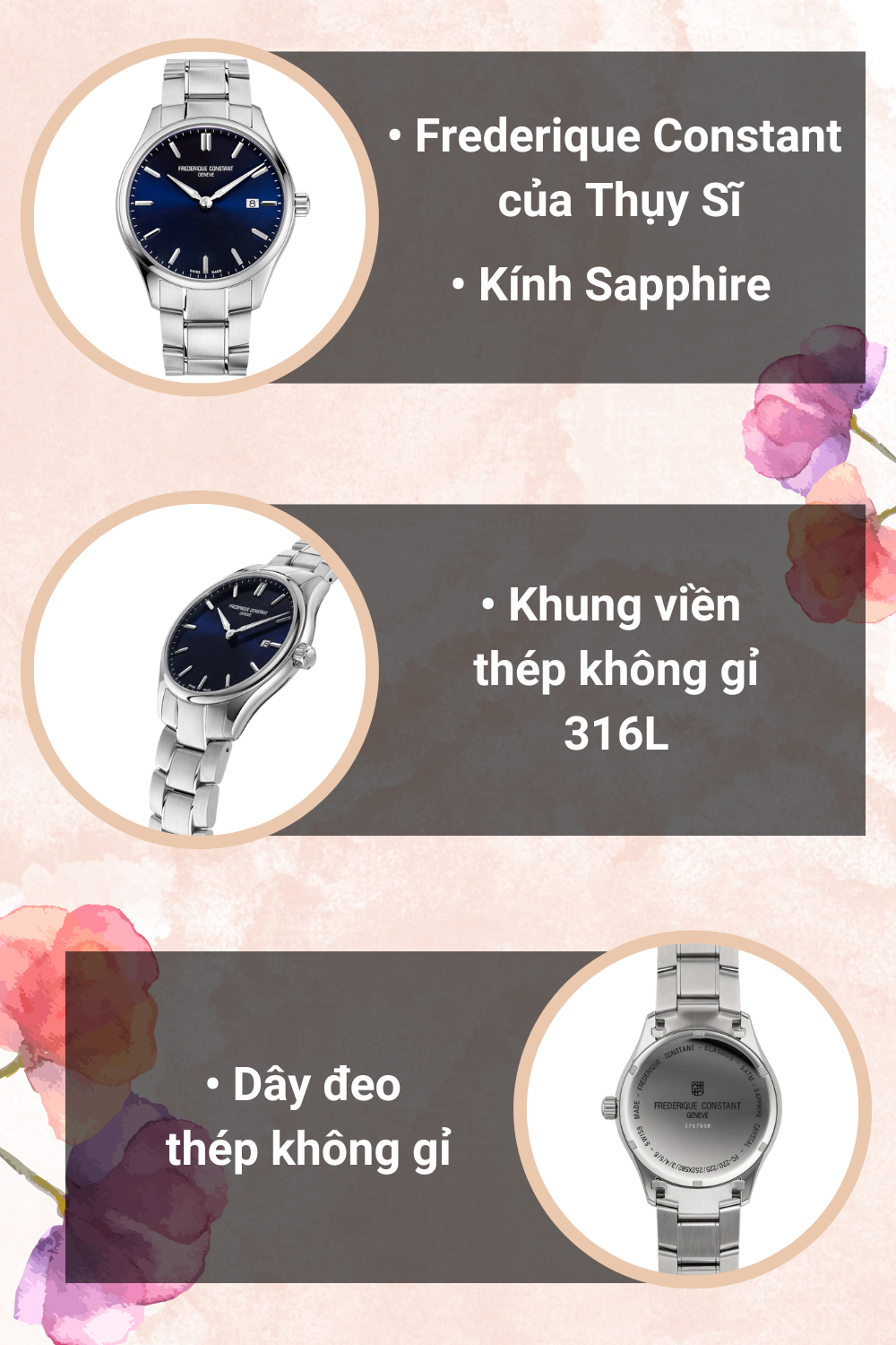 - Chiếc đồng hồ Frederique Constant đến từ Thụy Sĩ gây ấn tượng với kiểu dáng sang trọng và cao cấp
