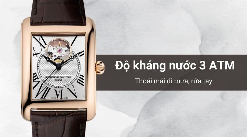 - Hệ số chống nước là 3 ATM để người dùng tự tin mang theo khi đi mưa nhỏ và rửa tay mà không sợ hư hỏng. Tuy nhiên, chỉ nên giữ đồng hồ ở nơi khô ráo trong lúc tắm, bơi hoặc lặn