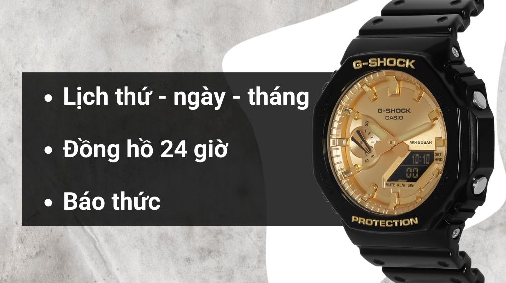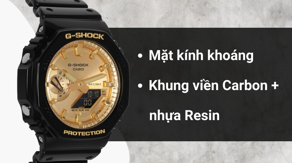 Tổng quan đồng hồChất liệu mặt kinh và khung viền của mẫu đồng hồChất liệu dây đeo của mẫu đồng hồKhả năng kháng nước của mẫu đồng hồTiện ích của mẫu đồng hồ • Đồng hồ G-Shock 2100 45.4 mm Nam GA-2100GB-1ADR thuộc dòng G-Shock của thương hiệu Casio với thiết kế độc đáo và ấn tượng, đây là một món phụ kiện thời trang hoàn hảo cho nam giới.