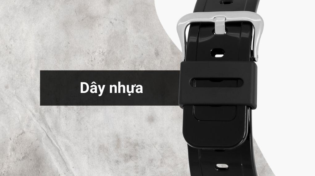 • Đặc biệt, dây đeo của đồng hồ được làm bằng nhựa, mang lại độ bền và sự thoải mái khi đeo. Khung viền bền bỉ được chế tạo từ carbon và nhựa resin, giúp đảm bảo độ cứng cáp và tuổi thọ theo thời gian.