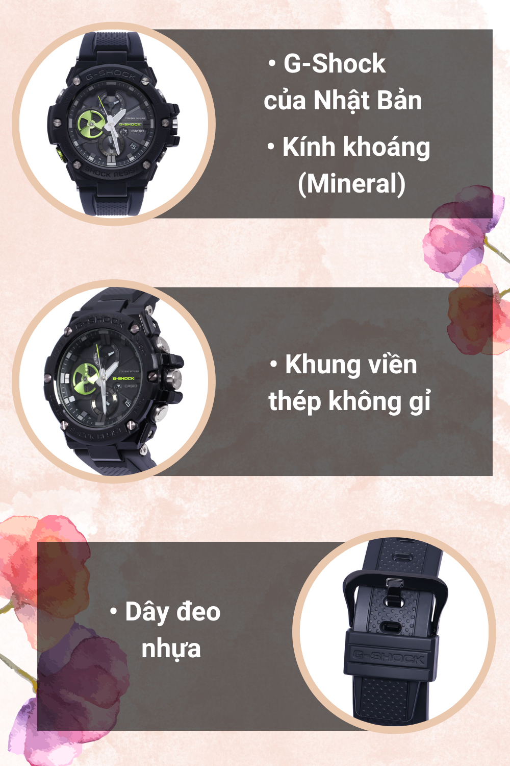 • Khung viền được làm từ thép không gỉ và dây đeo của đồng hồ được làm từ nhựa bền bỉ, chống nước tốt.