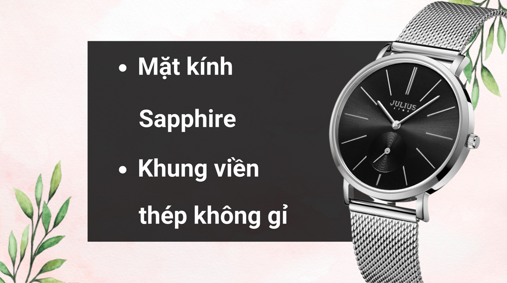 • Hãng đã sử dụng kính Sapphire có khả năng hạn chế trầy xước, bảo vệ trước những va đập thông thường mà không gây ra sự hư hại cho mặt kính giúp bạn có thể đeo mọi lúc mọi nơi. Hơn nữa, đồng hồ Julius này có kích thước mặt là 35 mm phù hợp với các quý cô kích thước cổ tay vừa hoặc có cổ tay nhỏ nhưng thích mặt đồng hồ lớn.