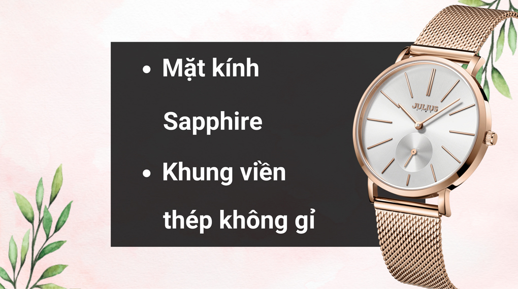 • Với kích thước đường kính 35 mm, đồng hồ Julius này được đánh giá là một tiêu chuẩn hoàn hảo để có thể tạo nên vẻ đẹp vừa vặn, hài hoà và cân đối trên bạn nam có cổ tay nhỏ đến trung bình. Ngoài ra, hãng đã sử dụng kính Sapphire có khả năng hạn chế trầy xước, bảo vệ trước những va đập thông thường mà không gây ra sự hư hại cho mặt kính giúp bạn có thể đeo mọi lúc mọi nơi.