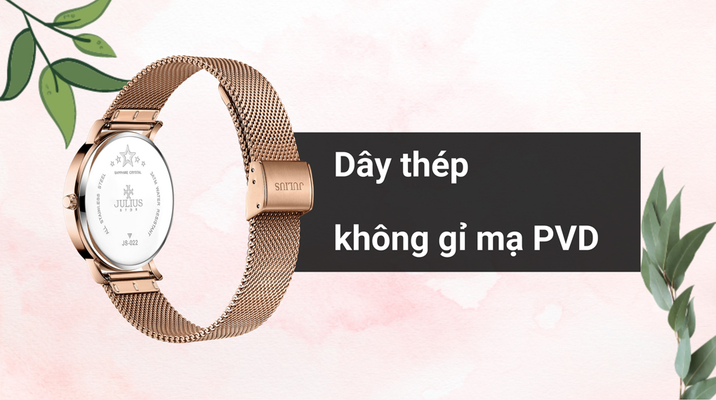 • Thương hiệu đã trang bị phần khung viền và dây đeo bằng chất liệu thép không gỉ, chất liệu có khả năng hạn chế ăn mòn cao trước tác động từ môi trường mang lại sự sang trọng và bền bỉ theo năm tháng cho người dùng. Đặc biệt, dây đeo của đồng hồ này được sử dụng công nghệ mạ PVD tiên tiến kết hợp với chất liệu là thép không gỉ giúp tăng độ bóng bẩy và độ bền lên đến 2 hoặc 3 lần so với các mẫu đồng hồ thông thường.