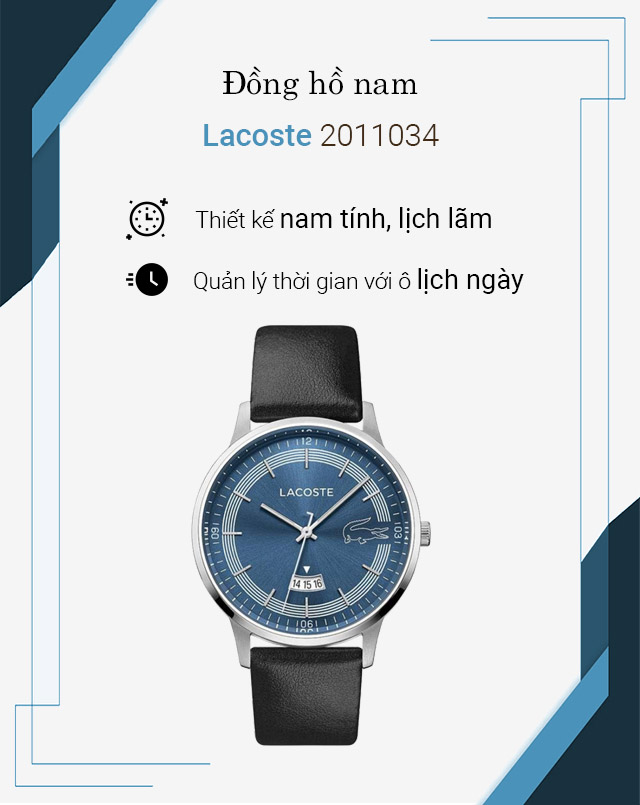 - Mẫu đồng hồ nam tính, tinh tế đến từ hãng đồng hồ Lacoste, thương hiệu đồng hồ đến từ Pháp