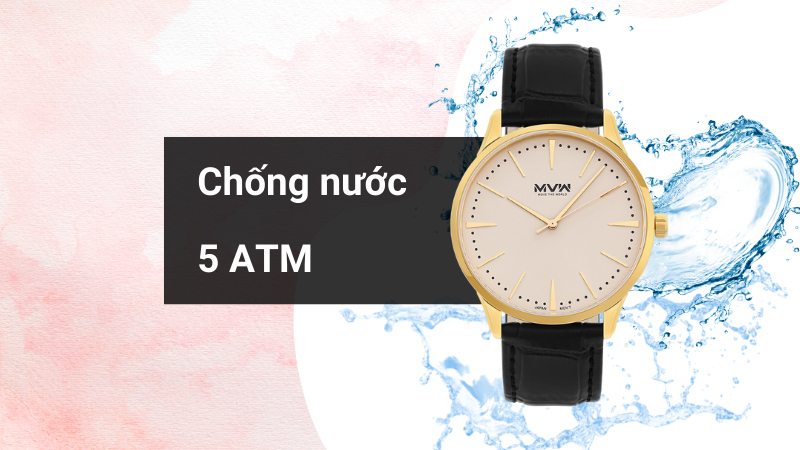 • Nước đã không còn là vấn đề lo ngại khi bạn có thể đeo đồng hồ ngay cả khi rửa tay, đi mưa hay đi tắm nhờ vào thông số chống nước 5 ATM tối ưu. Lưu ý: không đeo khi đi bơi, lặn.