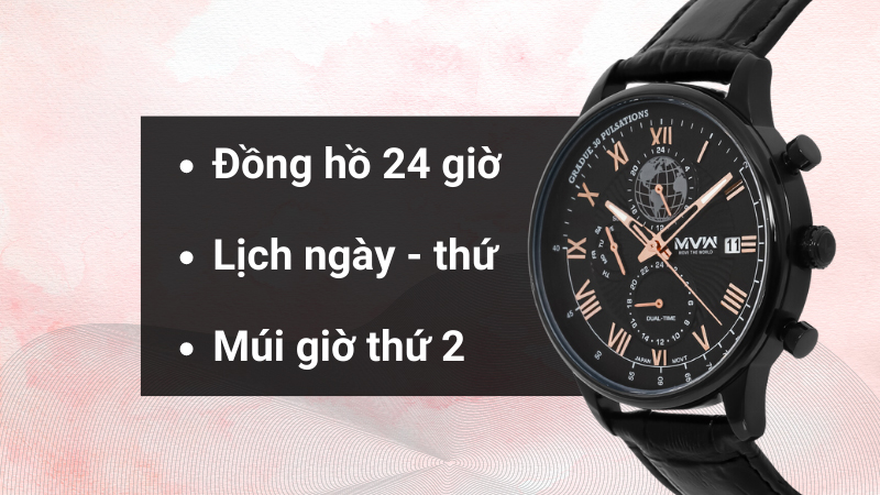 • Chiếc đồng hồ nam này có lịch ngày, lịch thứ, đồng hồ 24 giờ, múi giờ thứ hai vô cùng thuận tiện.