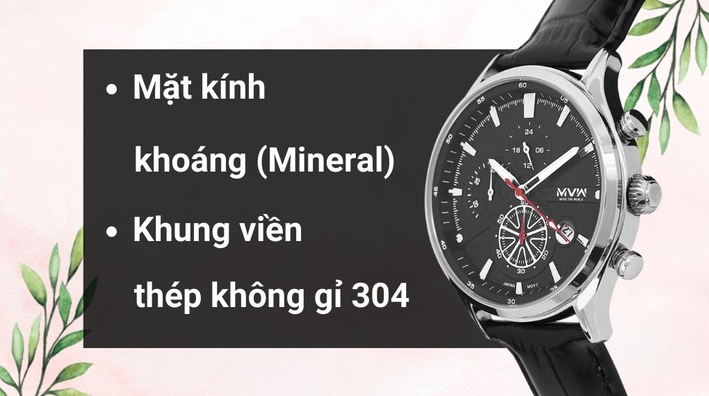 • Với đường kính mặt 43 mm, đồng hồ nam này đáp ứng nhu cầu của các bạn nam có cổ tay lớn hoặc yêu thích mặt đồng hồ lớn. Hơn nữa, MVW sử dụng chất liệu kính khoáng cho phần mặt kính, có thể chịu được trầy xước ở mức vừa phải và độ trong suốt cao giúp bạn quan sát giờ một cách dễ dàng.