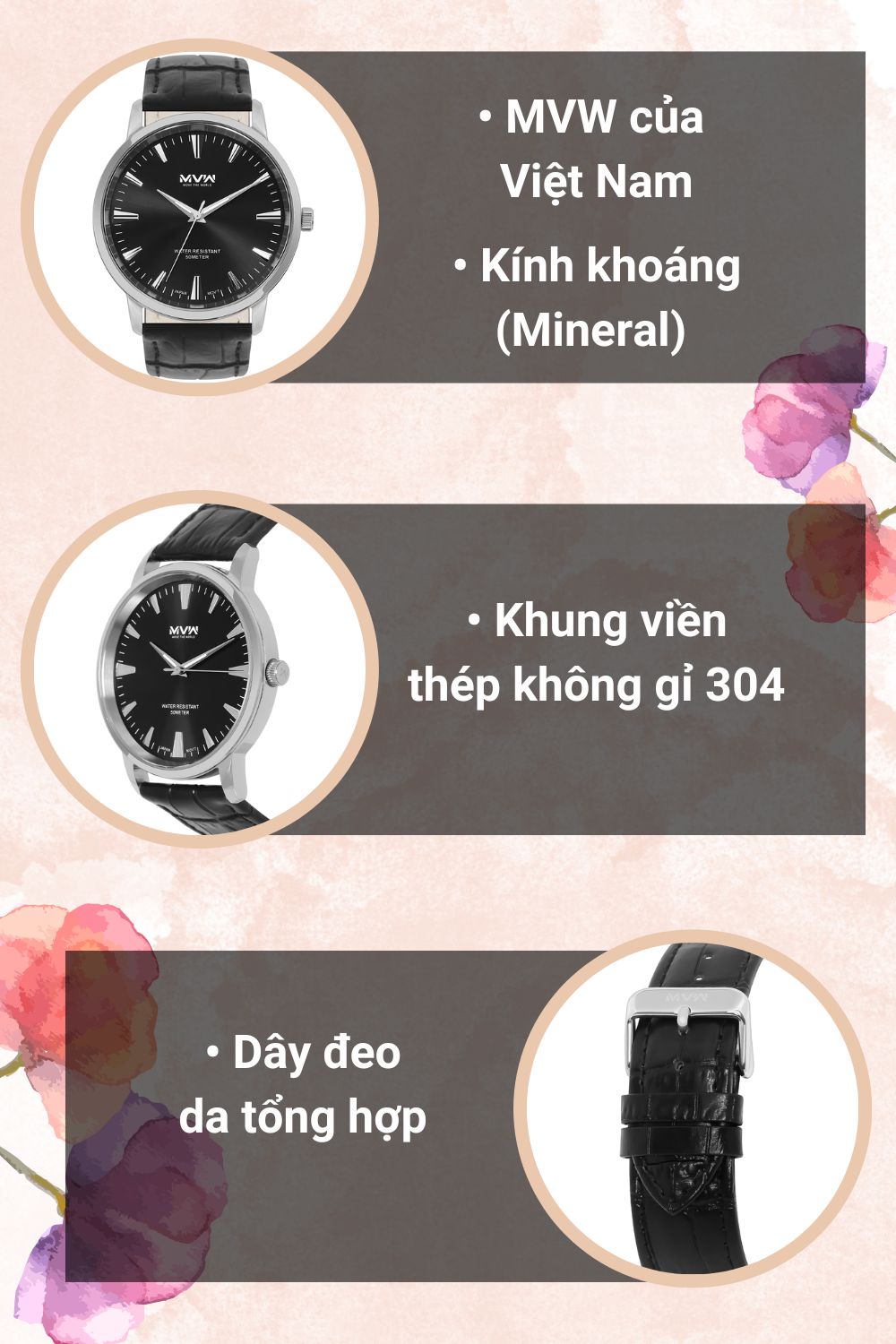 - Đồng hồ MVW với kiểu dáng, mẫu mã năng động, trẻ trung phù hợp với mọi lứa tuổi, đồng thời đồng hồ MVW còn mang vẻ đẹp sang trọng, lịch lãm.