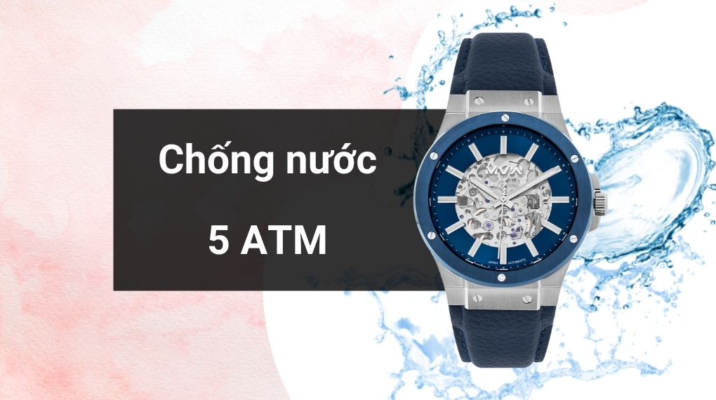 • Chỉ số 5 ATM là hệ số chống nước của chiếc đồng hồ MVW này, người dùng có thể thoải mái tiếp xúc nước khi rửa tay, tắm hoặc đi mưa. Tuy nhiên, không nên điều chỉnh nút vặn khi tiếp xúc nước và không đeo khi bơi hoặc lặn.