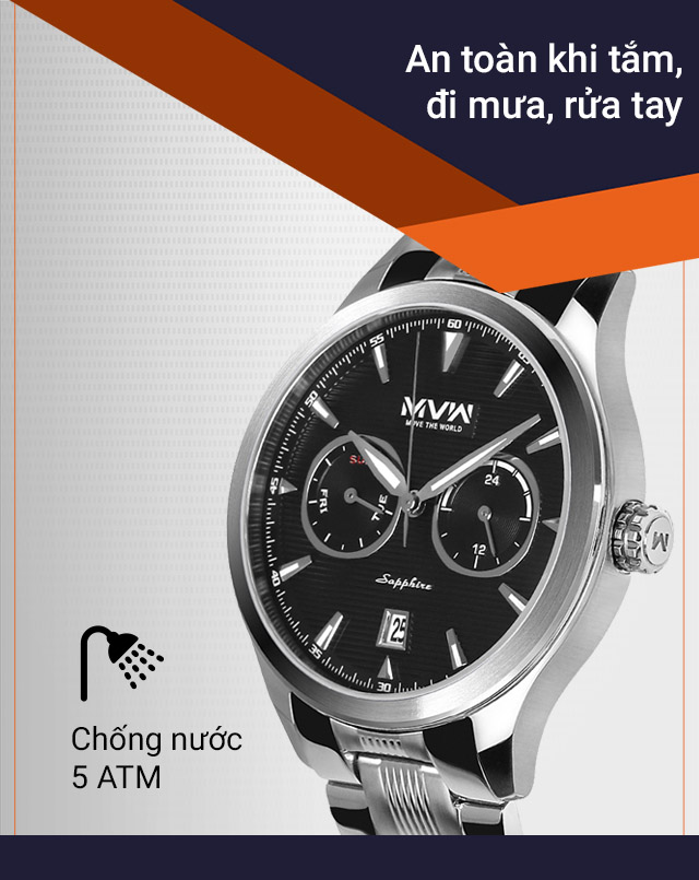 - Nhờ hệ số chống nước 5 ATM, người dùng hoàn toàn có thể đeo đồng hồ khi tắm, đi mưa hay rửa tay, không mang khi bơi lội, lặn