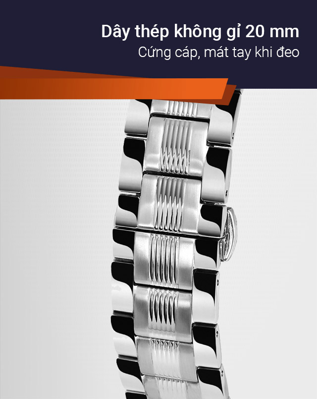 - Được trang bị khung viền và dây đeo làm từ chất liệu thép không gỉ sáng bóng, sang trọng