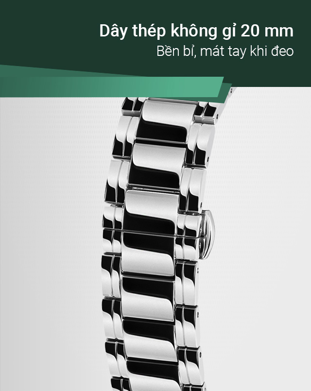- Đồng hồ được trang bị khung viền và dây đeo đều được làm từ chất liệu thép không gỉ cứng cáp, sáng bóng