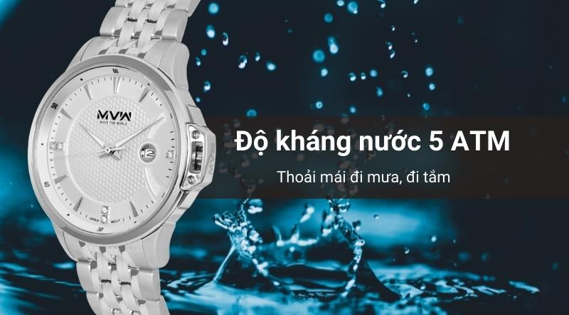 - Nước đã không còn là vấn đề lo ngại khi bạn có thể đeo đồng hồ ngay cả khi rửa tay, đi mưa hay đi tắm nhờ vào thông số chống nước 5 ATM tối ưu. Lưu ý: không đeo khi đi bơi, lặn.