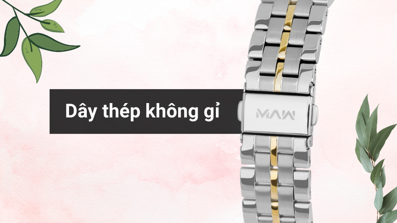 • Chất liệu của khung viền và dây đeo đều được làm từ thép không gỉ cứng cáp, bền bỉ với thời gian. Chất liệu này giúp đồng hồ dễ dàng lau chùi, luôn giữ được vẻ sáng bóng.