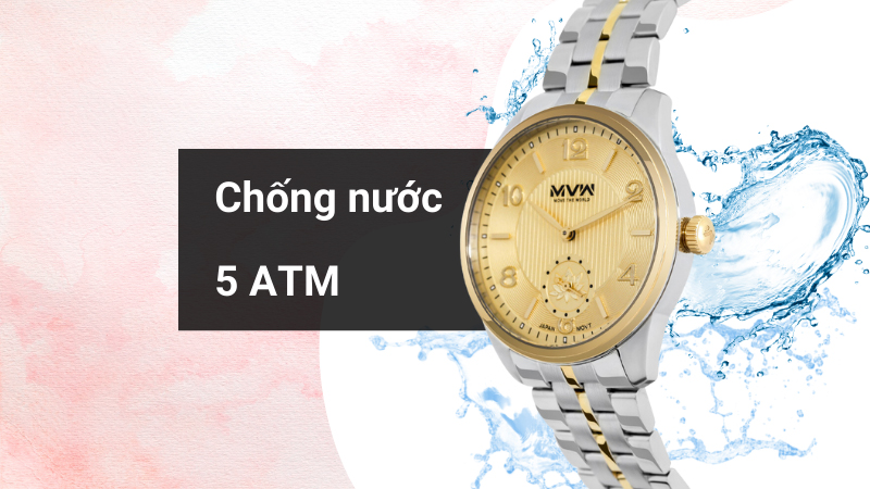 • 5 ATM là độ kháng nước của chiếc đồng hồ nam này, người dùng có thể an toàn đeo khi đi mưa, đi tắm. Lưu ý: không nên mang khi đi bơi hay lặn.