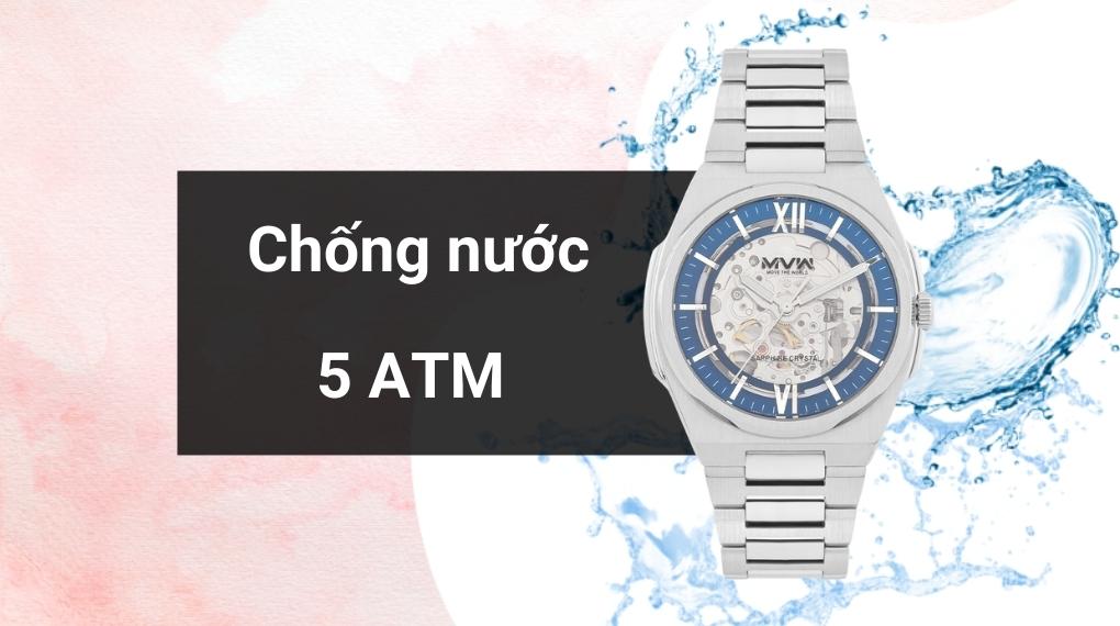 • Chiếc đồng hồ có khả năng kháng nước lên đến 5 ATM - hệ số được nhiều chuyên gia đánh giá là phù hợp cho các chàng trai bận rộn, với hệ số này các chàng có thể mang theo đồng hồ cả khi đi mưa hay đi tắm mà không gặp trở ngại gì. Lưu ý: không nên mang theo khi bơi hoặc lặn.