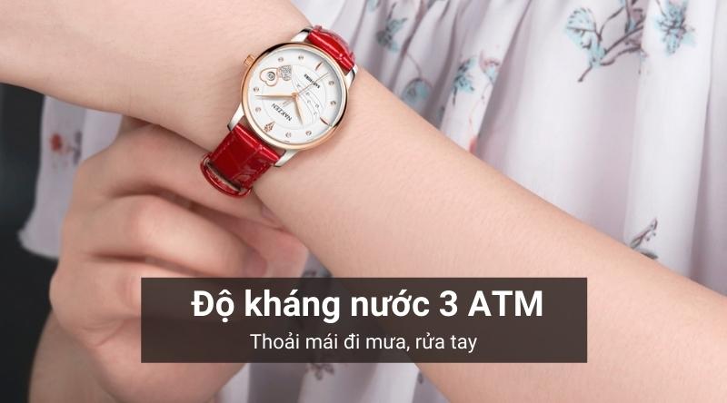 - Người dùng có thể yên tâm đi dưới mưa và rửa tay mà không lo bị hư hỏng vì hệ số chống nước của mẫu đồng hồ nữ này là 3 ATM. Lưu ý: không nên đeo khi đi tắm, đi bơi, lặn.