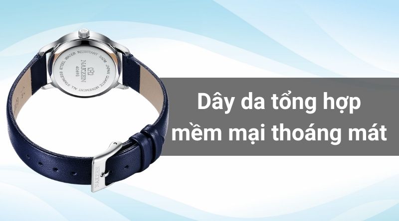 - Chất liệu dây da tổng hợp, khi đeo tạo cảm giác mềm mại thoáng mát. Khung viền làm bằng thép không gỉ. Bề mặt thép được gia công theo hai dạng bóng mờ và bóng sáng, điều này tạo nên sự đặc biệt, giúp các chi tiết của đồng hồ tinh tế hơn.