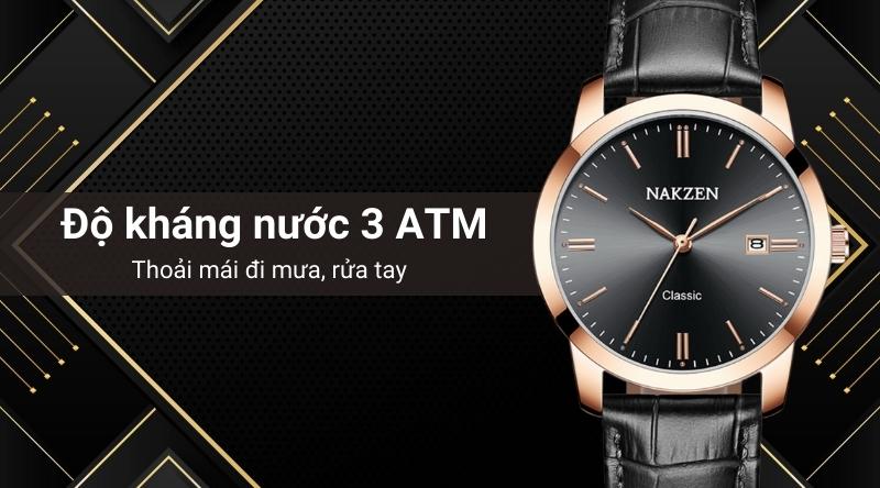 - 3 ATM là độ kháng nước của chiếc đồng hồ nam này, người dùng có thể an toàn đeo khi đi mưa, rửa tay. Lưu ý: không nên mang khi đi tắm, bơi hay lặn.