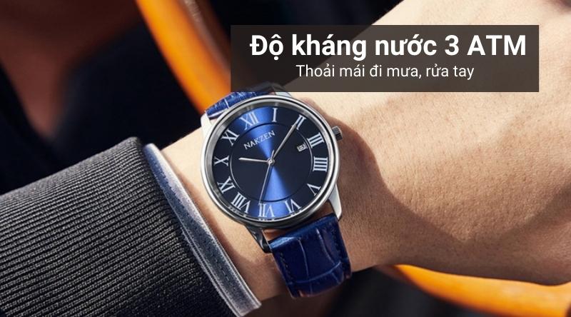 - Người dùng có thể yên tâm đi dưới mưa và rửa tay mà không lo bị hư hỏng vì hệ số chống nước của mẫu đồng hồ nam này là 3 ATM. Lưu ý: không nên đeo khi đi tắm, đi bơi, lặn.