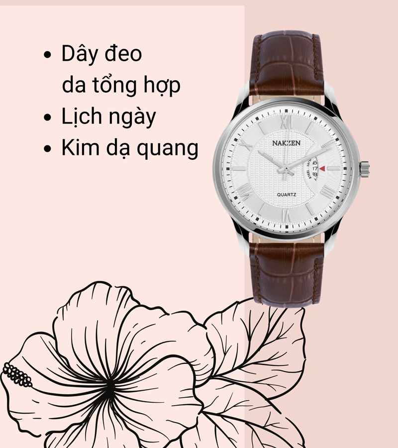 • Đồng hồ Nakzen được trang bị dây da tổng hợp cho phần dây đeo mang lại cảm giác êm nhẹ khi đeo. Phần khung viền của sản phẩm làm bằng chất liệu thép không gỉ, có khả năng hạn chế ăn mòn khá trước tác động từ môi trường mang lại bền bỉ theo năm tháng cho người dùng.