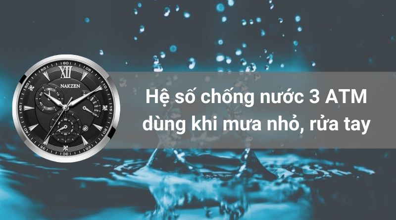 - Nhờ có khả năng kháng nước 3 ATM, đồng hồ này có thể đeo khi đi mưa nhỏ và rửa tay. Lưu ý không sử dụng đồng hồ khi đi bơi, lặn, đi tắm.
