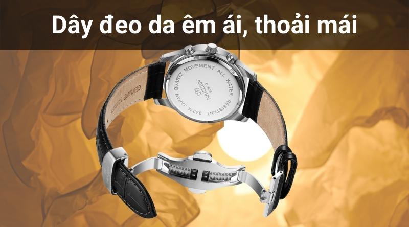 - Dây đeo da êm ái tạo cảm giác thoải mái cho người dùng. Khung viền làm bằng thép không gỉ, độ bền cao, chống ăn mòn và trầy xước. Bề mặt thép được gia công theo hai dạng bóng mờ và bóng sáng, điều này tạo nên sự đặc biệt, giúp các chi tiết của đồng hồ tinh tế hơn.