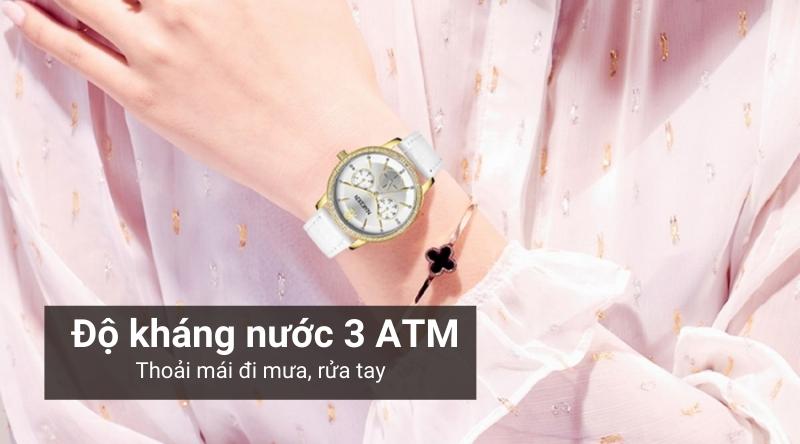 - Yên tâm đeo đồng hồ nữ này đi mưa, rửa tay vì hệ số chống nước là 3 ATM, không nên sử dụng khi đi tắm, đi bơi, lặn.
