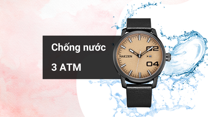 • 3 ATM là độ kháng nước của chiếc đồng hồ nam này, người dùng có thể an toàn đeo khi đi mưa, rửa tay. Lưu ý: không nên mang khi đi tắm, bơi hay lặn.