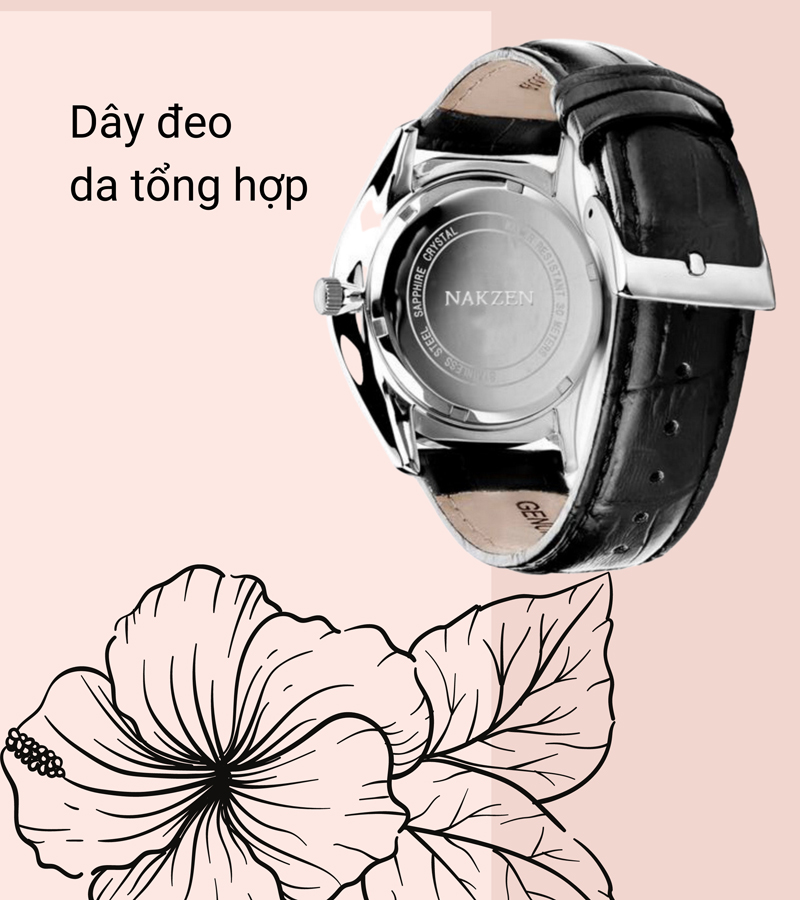 • Dây đồng hồ được làm bằng da tổng hợp, với thiết kế đục lỗ cho phép điều chỉnh nhiều kích cỡ cổ tay để đeo vừa vặn và thoải mái. Khung viền của sản phẩm được chế tạo từ thép không gỉ, chống ăn mòn và tăng độ bền theo thời gian, đảm bảo sự bền vững và đáng tin cậy cho người dùng.