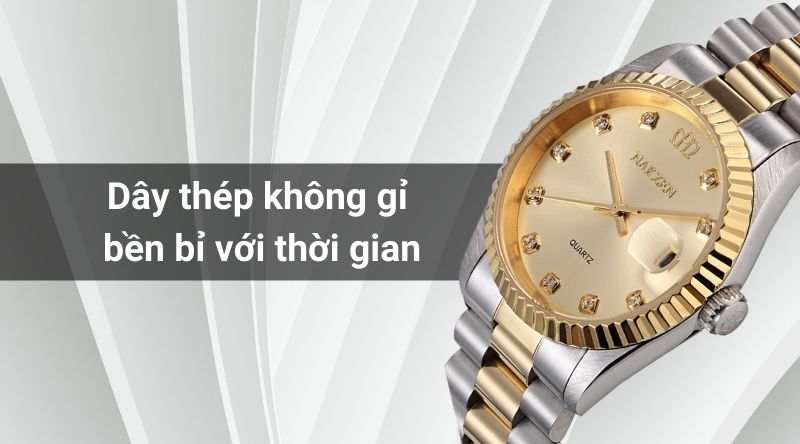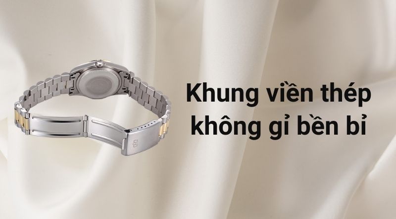 - Chất liệu dây thép không gỉ, có độ cứng cao, bền bỉ, chống ăn mòn tốt. Khung viền làm bằng thép không gỉ. Bề mặt thép được gia công theo hai dạng bóng mờ và bóng sáng, điều này tạo nên sự đặc biệt, giúp các chi tiết của đồng hồ tinh tế hơn.