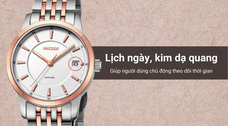 - Hỗ trợ tiện ích lịch ngày trên mặt đồng hồ, kim dạ quang giúp người dùng theo dõi thời gian trong bóng tối dễ dàng hơn.