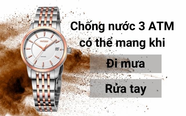 - Đồng hồ có thể mang đi mưa hay rửa tay với khả năng kháng nước 3 ATM. Lưu ý không sử dụng đồng hồ khi đi tắm, đi bơi, lặn.