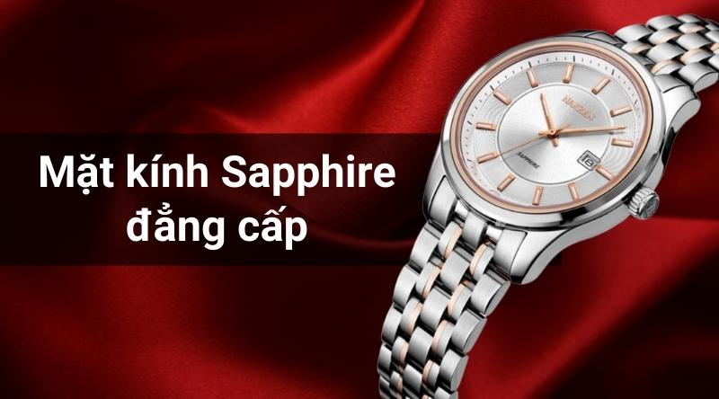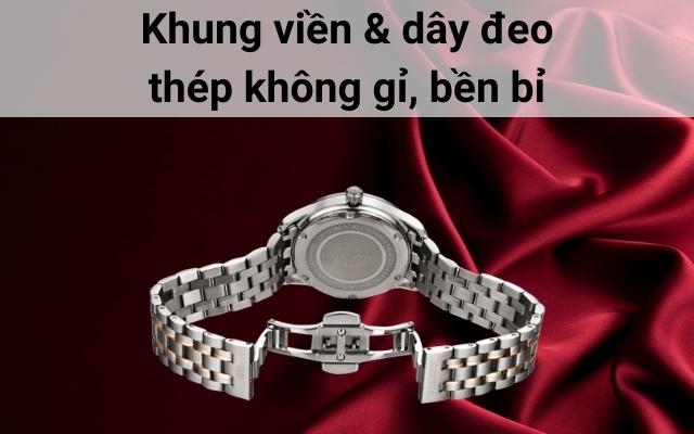 - Đồng hồ nữ sở hữu khung viền và dây đeo nổi bật trong chất liệu thép không gỉ, đầy sự thu hút.