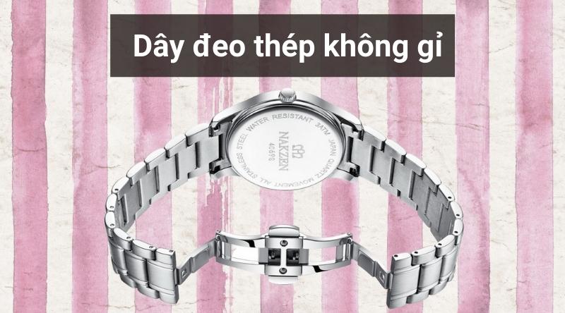 - Chất liệu của khung viền và dây đeo đều được làm từ thép không gỉ cứng cáp, bền bỉ với thời gian. Chất liệu này giúp đồng hồ dễ dàng lau chùi, luôn giữ được vẻ sáng bóng.