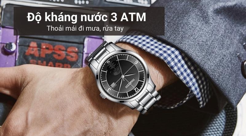 - Khả năng chống nước của mẫu đồng hồ nam này là 3 ATM, người dùng hoàn toàn có thể sử dụng khi đi mưa, rửa tay. Không nên sử dụng khi đi tắm, đi bơi hay lặn.