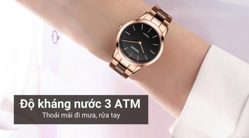 - Người dùng có thể yên tâm đi dưới mưa và rửa tay mà không lo bị hư hỏng vì hệ số chống nước của mẫu đồng hồ nữ này là 3 ATM. Lưu ý: không nên đeo khi đi tắm, đi bơi, lặn.