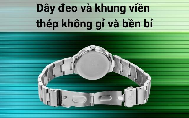 - Đồng hồ được trang bị khung viền và dây đeo đều làm bằng thép không gỉ, bền bỉ với thời gian, chịu được mọi thời tiết.