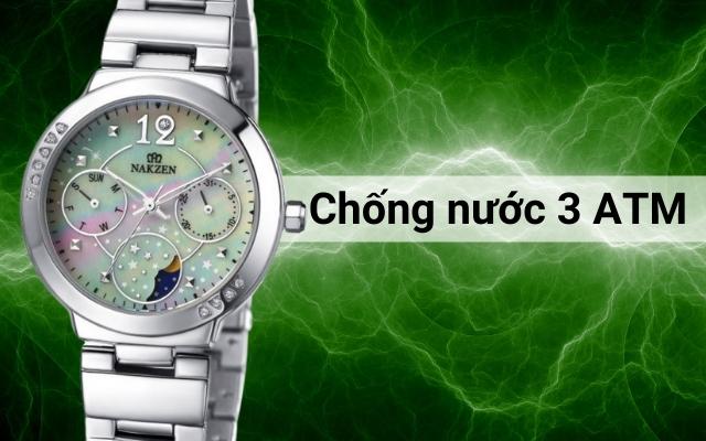 - Mẫu đồng hồ nữ này có độ chống nước 3 ATM. Có thể mang khi rửa tay và đi dưới trời mưa nhỏ. Lưu ý không sử dụng đồng hồ khi đi bơi, lặn, đi tắm.