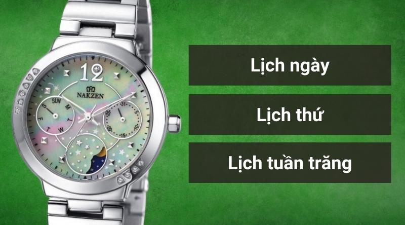 - Đồng hồ trang bị tiện ích lịch ngày, lịch thứ ngay trên mặt đồng hồ. Ngoài ra còn có thêm cả lịch tuần trăng giúp người dùng theo dõi thuận tiện.
