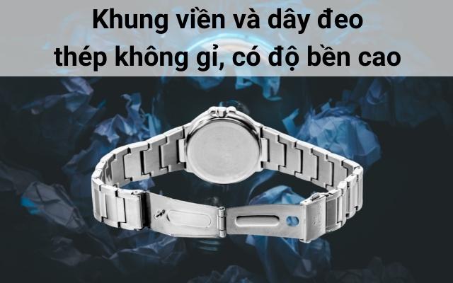 - Đồng hồ nữ nổi bật trong màu bạc với khung viền và dây đeo làm bằng thép không gỉ, độ bền cao, chịu lực tốt.