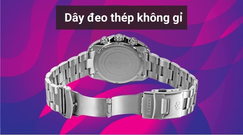 - Chất liệu của khung viền và dây đeo đều được làm từ thép không gỉ cứng cáp, bền bỉ với thời gian. Chất liệu này giúp đồng hồ dễ dàng lau chùi, luôn giữ được vẻ sáng bóng.