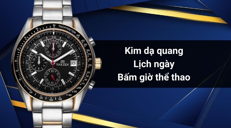 - Đồng hồ hỗ trợ lịch ngày và bấm giờ thể thao giúp người dùng chủ động theo dõi thời gian. Ngoài ra đồng hồ còn có kim dạ quang yên tâm xem giờ trong bóng tối.